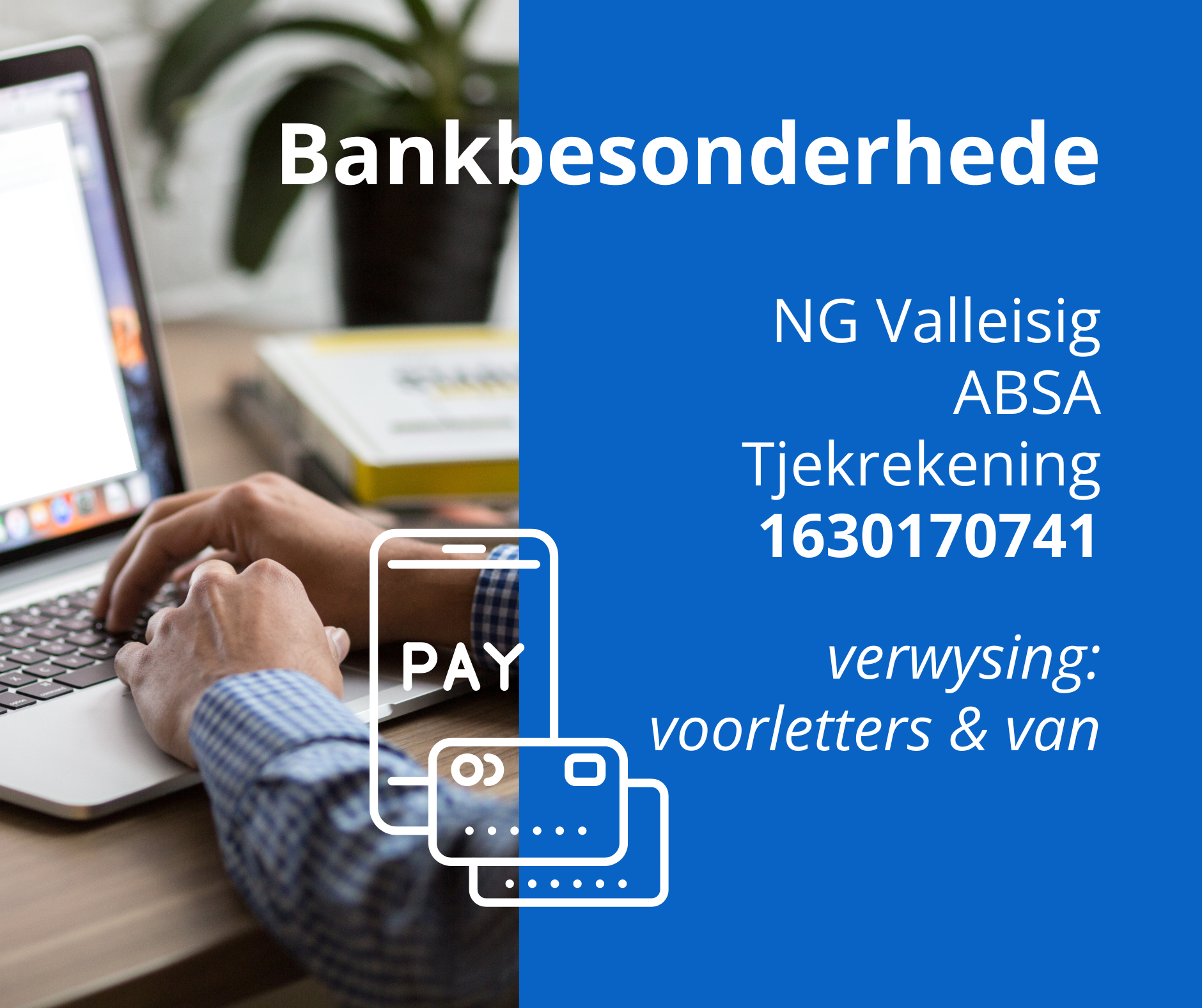 Gee vry deur ‘n eenmalige elektroniese oorbetaling of stel jou bankdienste vir ‘n maandelikse bydrae.